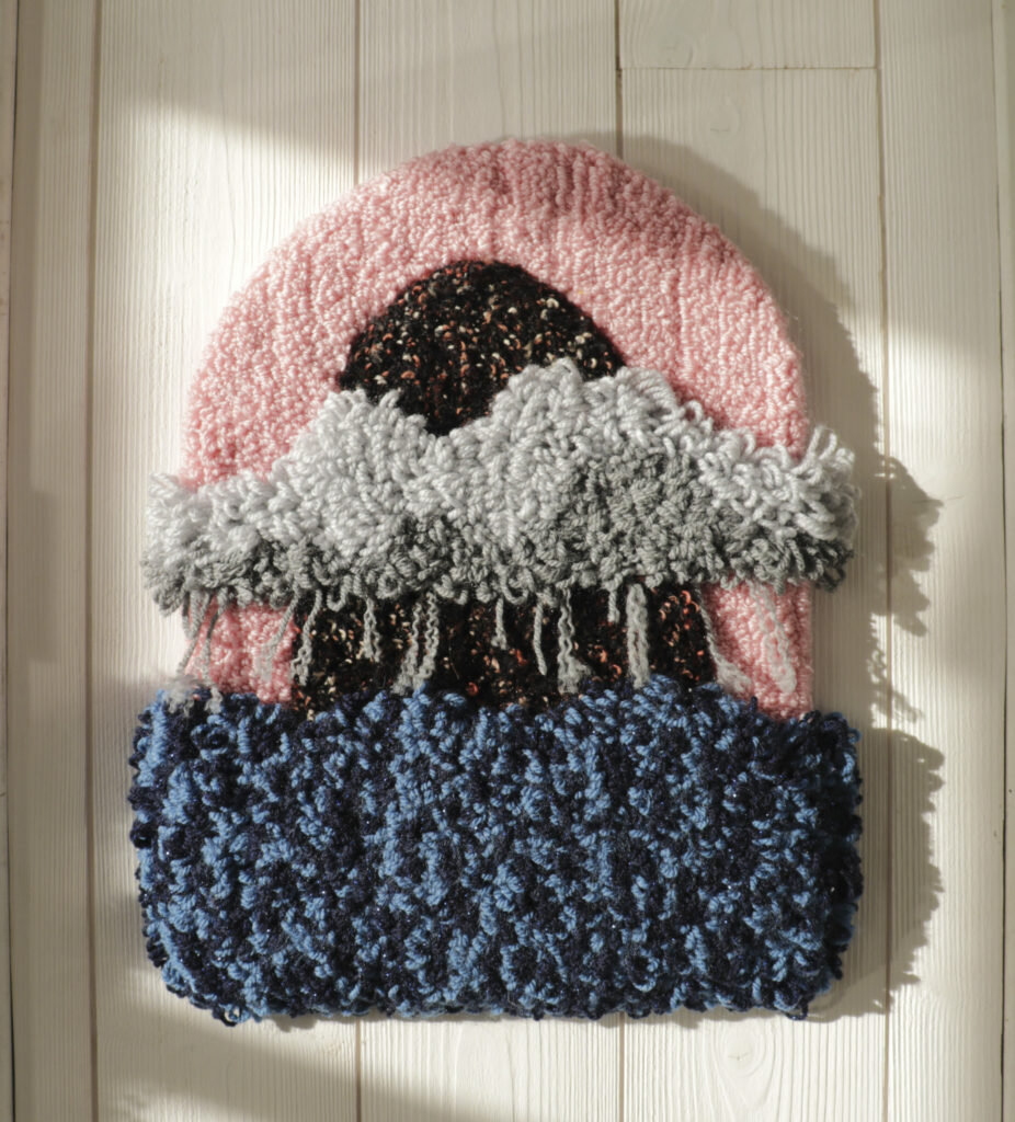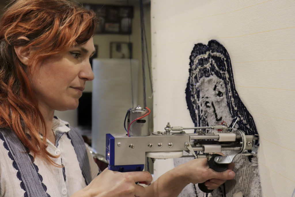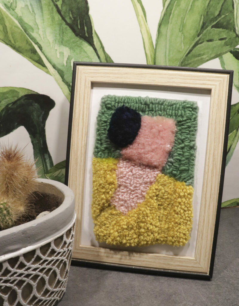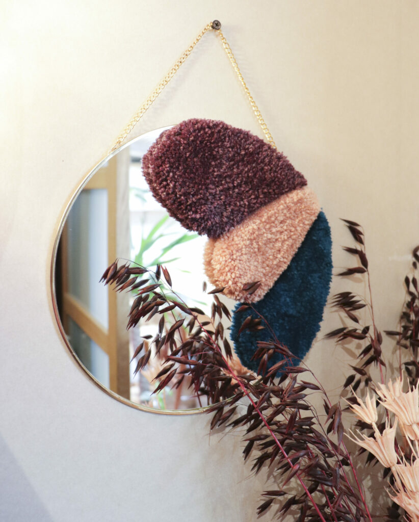 Je choisi mon fil ou laine pour le projet, je prépare mes pelotes et je commence le ”tufting”. Une fois complété, j’applique une colle à tapis de haute qualité à l’arrière pour tout sécuriser.